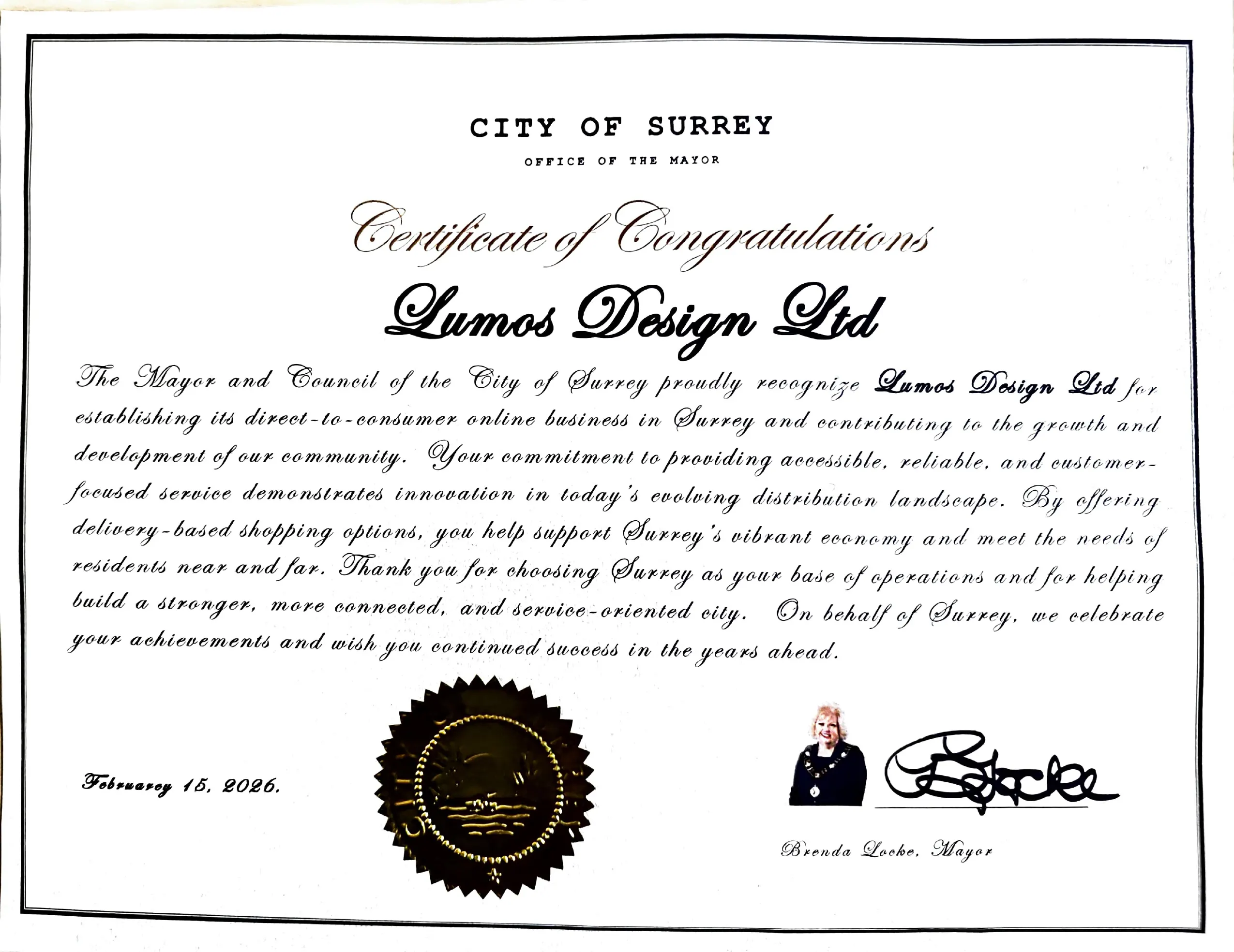 This certificate celebrates Lumos Design Ltd.’s commitment to the community and our innovative approach to business.